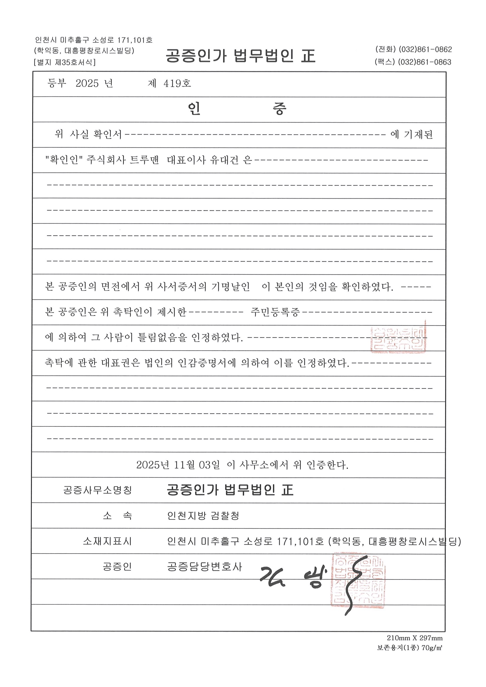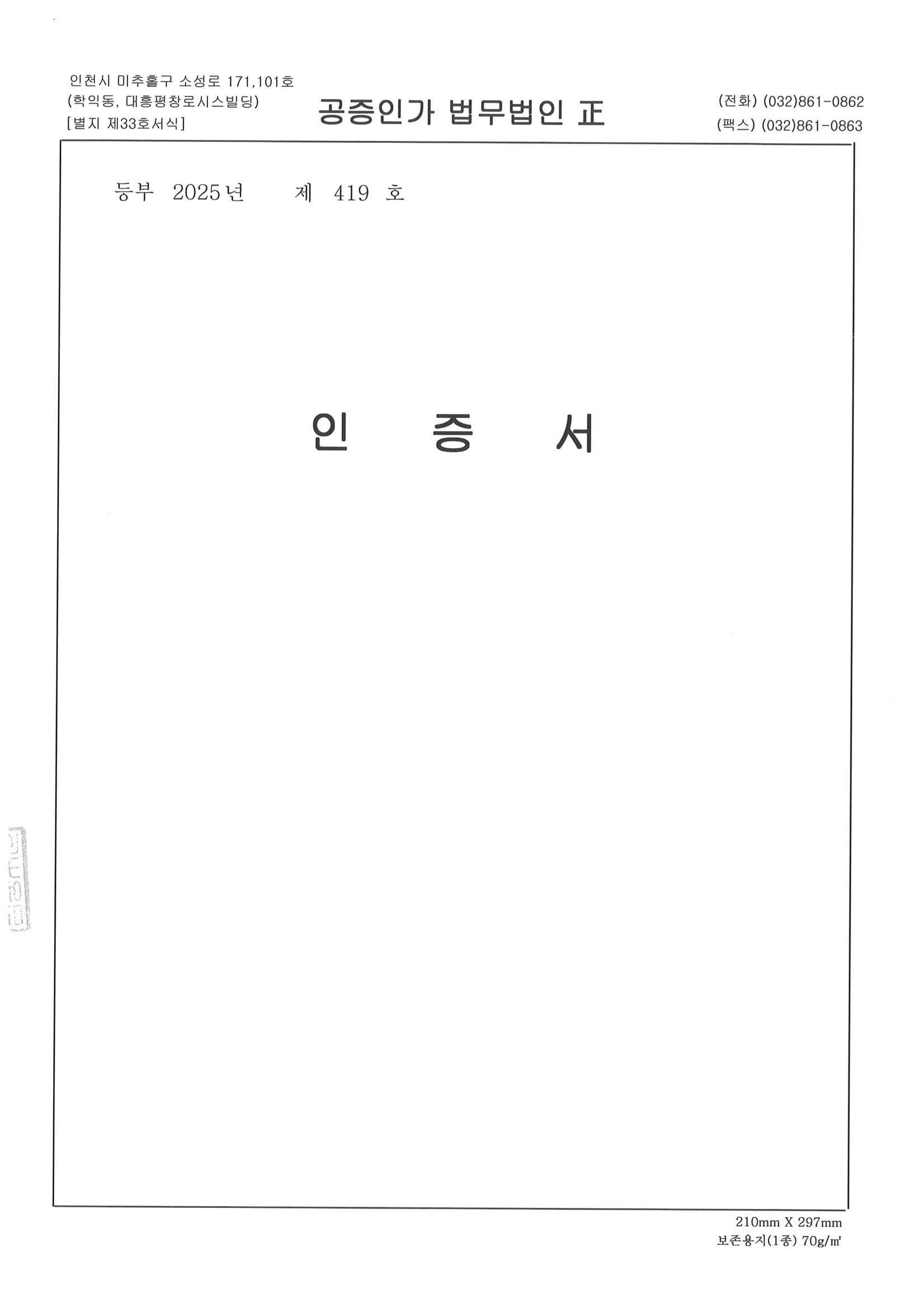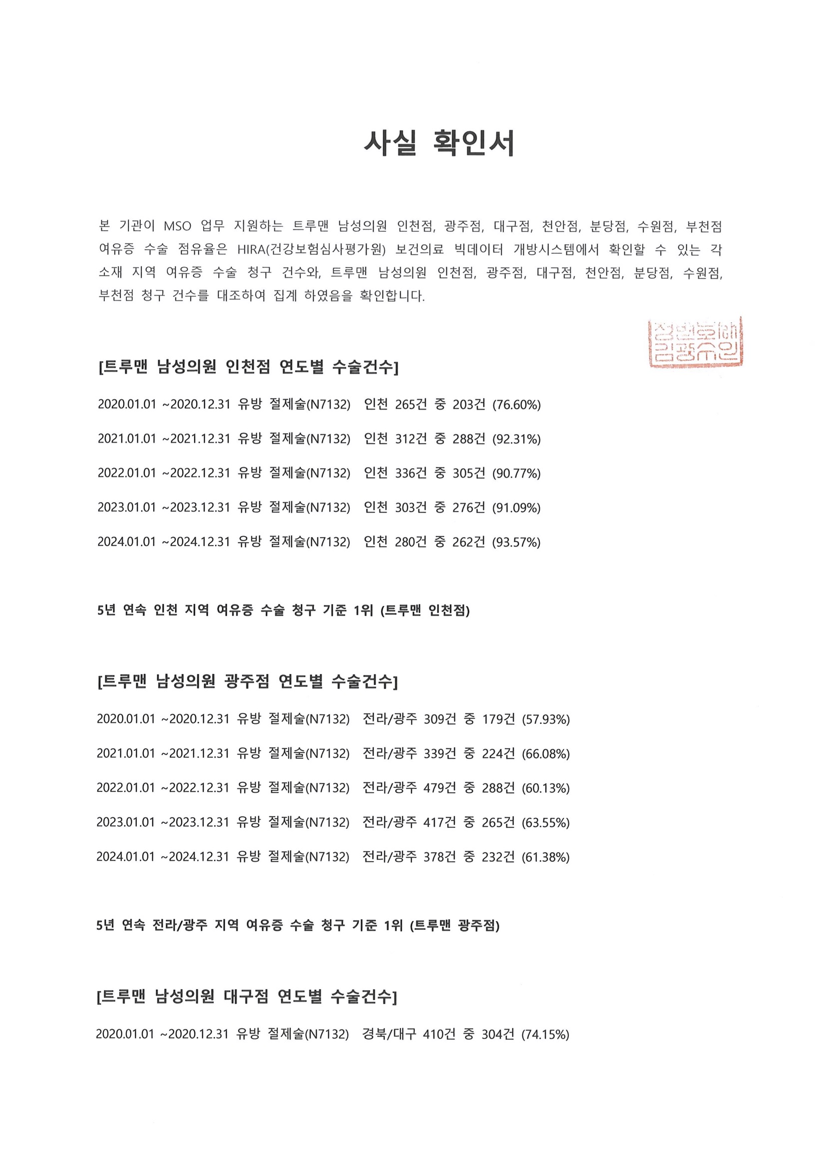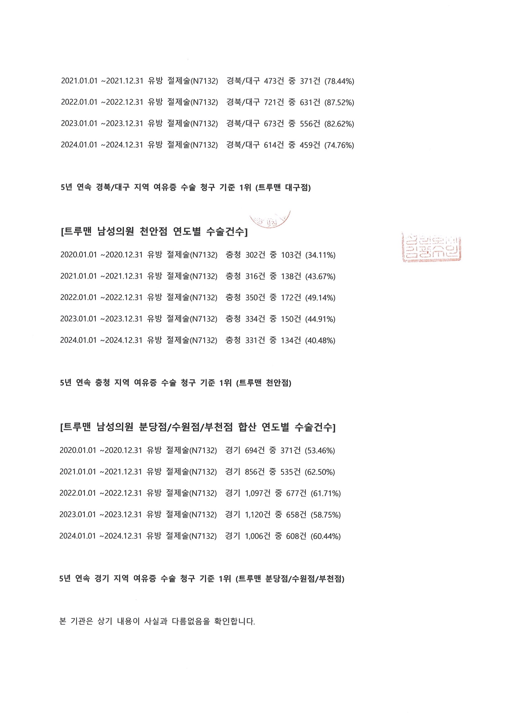 여유증 수술 건수 사실확인서 법무법인 공증 완료